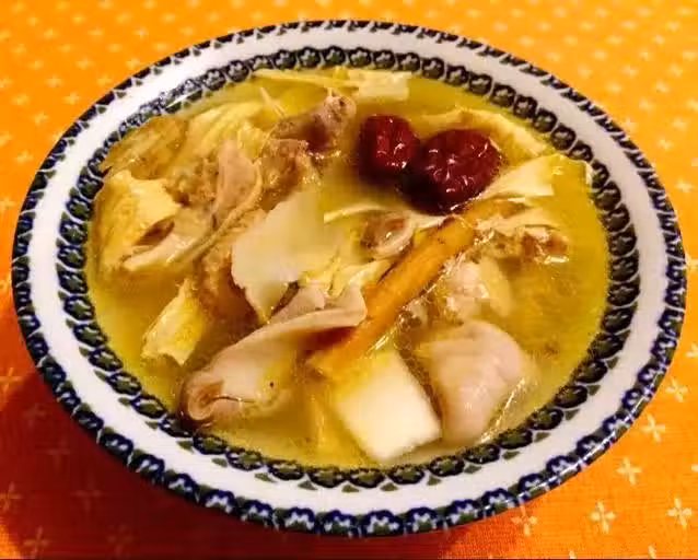 豬肚半個;老雞半隻;沙骨300克;黨參三條;北芪(或黃芪)數片;玉竹適量;枸杞適量;紅棗五、六粒;桂圓四、五粒;白鬍椒一把;薑片數片;白果適量;腐竹三,四條;淮山三、四片