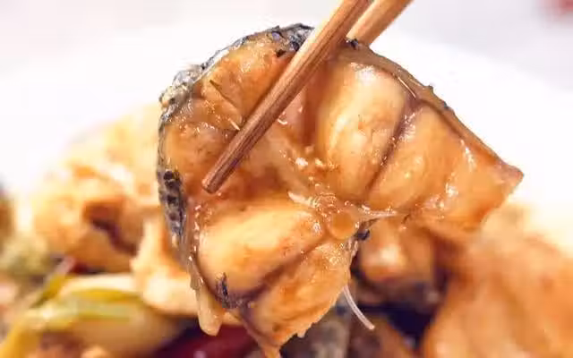 4、煎魚的底油炒香蔥、姜、辣椒、花椒、八角;加入適量的溫水、鹽、醬油、醋、料酒、白糖煮開;放入煎好的黑魚塊,大火煮開,小火燒一會;燒至湯汁濃香,加入少許雞精拌勻即可。
