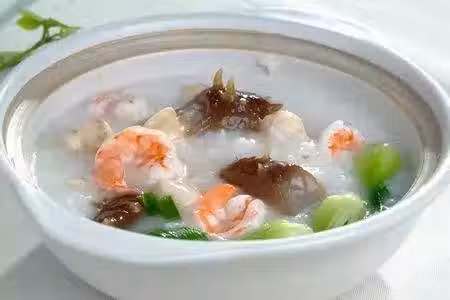 食材:大米100g、蝦8個、魷魚1個、甜玉米粒30g、豌豆30g、白鬍椒粉2g、鹽3g、姜適量、干香菇5朵
