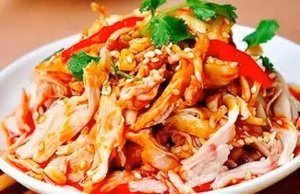 4、然後往蔥薑末裡面到生抽醋鹽蚝油辣椒油調成一個汁,把調味汁倒進雞肉里拌勻