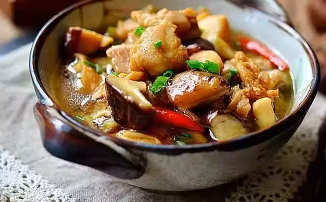 6、炒至雞肉變色時加入香菇塊翻炒均勻,加適量鹽調味出鍋。