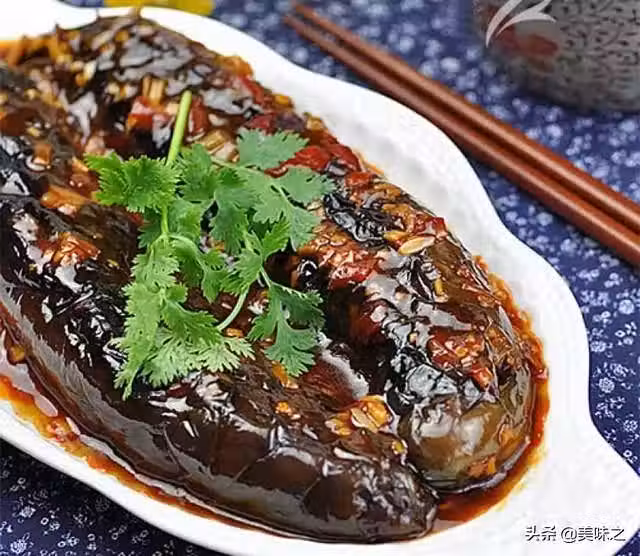 9、小心將茄子出鍋裝盤,放上香菜即可。