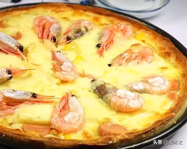7、表面碼上北極蝦,再撒上一層奶酪。