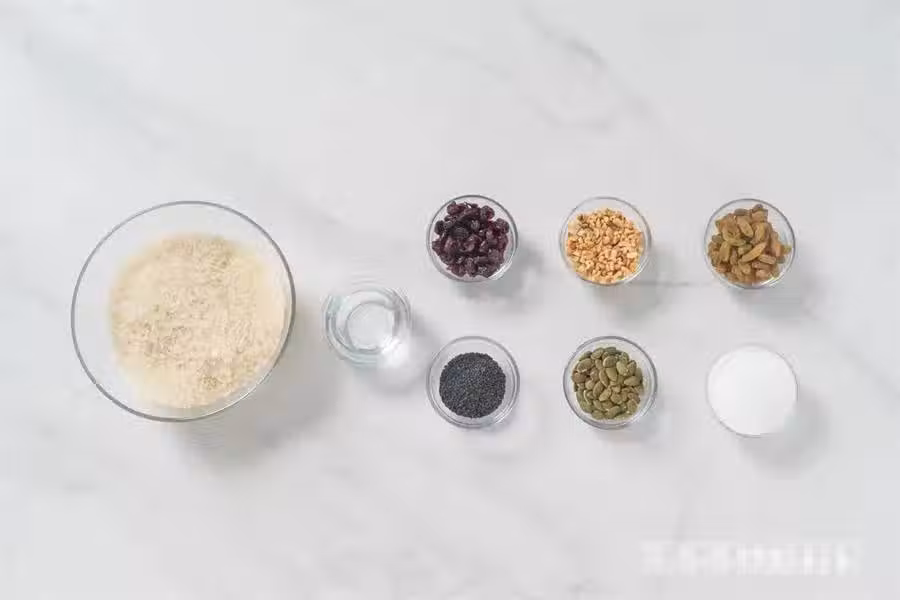 陰米 200g / 黑芝麻 15g提子乾 40g / 蔓越莓干 30g南瓜子 20g / 花生碎 30g砂糖 70g / 水飴 70g水 40g / 油 適量