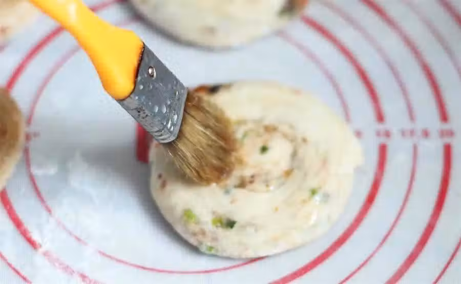 「11」把抹了蜂蜜水的燒餅坯向下放在芝麻上,用手稍稍按一下,拿起來;粘芝麻的一面朝上擺放在烤盤上;