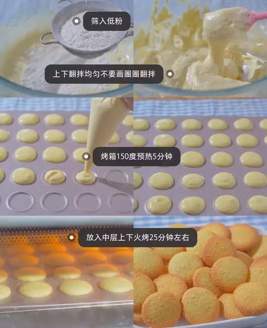 小貼士:配方的量可以烤45塊小餅乾,我的烤盤30個的,分2次烤的,第一次沒用完的麵糊我放入冰箱冷凍備用的,第一盤出爐了,立即取出擠入烤盤送入烤箱,沒有消泡,烤盤不夠大的,你們也可以這樣做哈