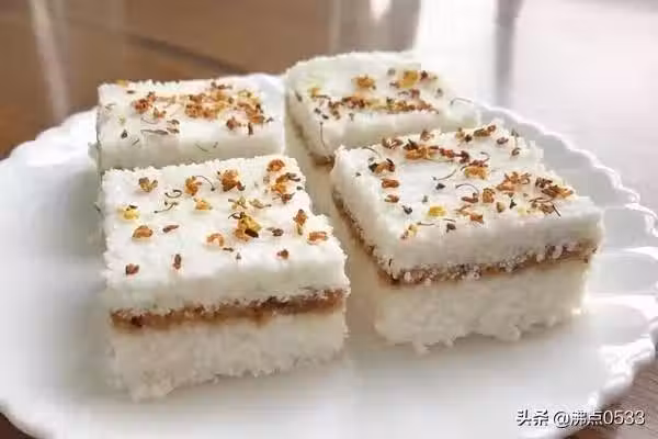 3、模具底部襯上油紙或紗布,將糕粉鬆鬆地鋪平整但不要壓緊實,蓋上一塊濕紗布,上鍋蒸30分鐘左右,手指按上去沒有乾粉即可熄火取出,乘熱撒上干桂花,晾涼後脫模切塊即可食用。