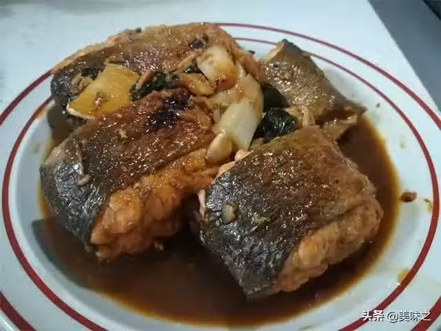 大馬哈魚尾一段、蔥適量、姜適量、蒜適量、食用油適量、醬油適量、鹽適量、黃酒適量、糖適量。