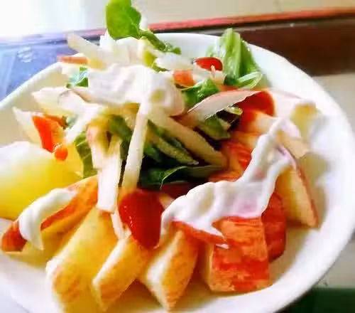 1.蘋果洗凈,去皮切丁,加入適量的沙拉醬,拌勻