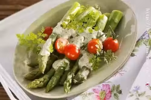 10.撈起,瀝干水分,放在蘆筍與玉米上。