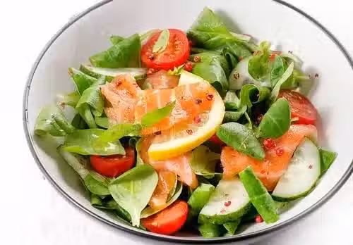 6.三文魚對摺後捲起來,捲成玫瑰花的樣子,擺在拌好的菜上即成。