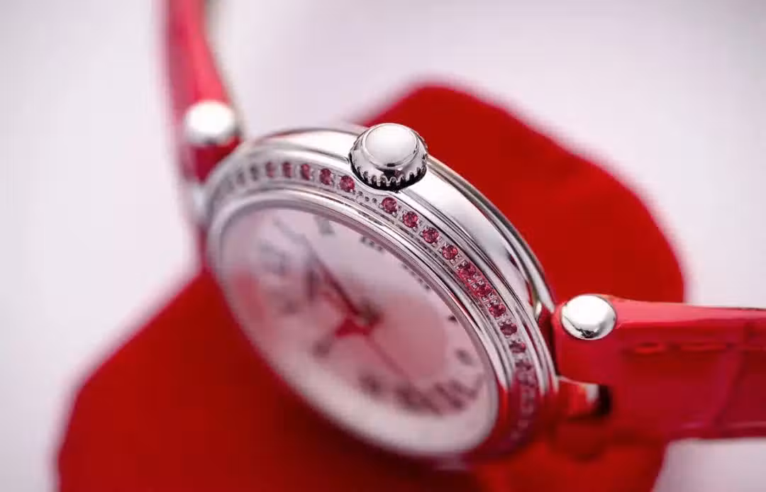 26毫米直徑的表殼由精鋼材質打造而成,從側面可以看到它的錶冠上鑲嵌有白色陶瓷凸圓寶石,色澤溫潤,為腕錶增添了幾分别致美感。
