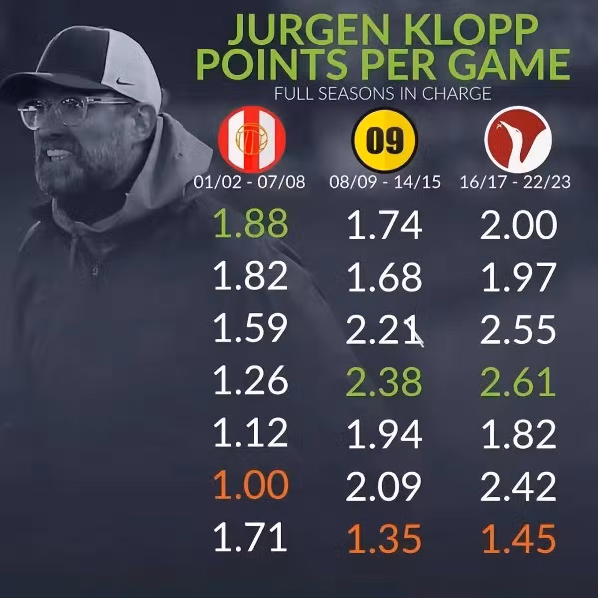 克洛普執教利物浦來到了第七個年頭,球隊在2023年英超聯賽0勝,足總杯出局,可以說克洛普執教利物浦遭遇最大的低谷。對此,知名數據機構《WhoScored》盤點了克洛普在不同三支球隊的「七年之癢」,並列出賽季場均拿分情況!