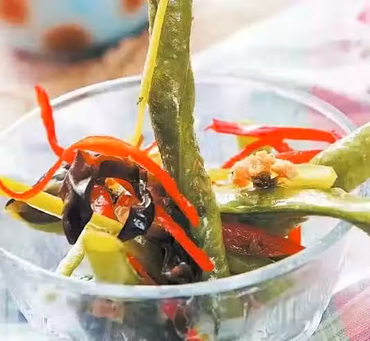 1、四季豆去筋,洗凈,切段,放入熱油鍋中炸至表面起泡,撈出瀝油;青、紅椒、黑木耳均切絲;蝦米剁細,與肉末一起加入料酒拌勻。