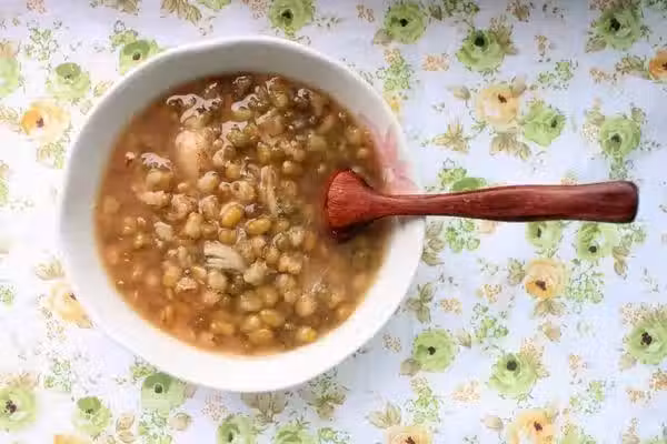 綠豆、百合、冰糖,加水,一起丟進電壓力鍋。選擇豆類,按一下按鈕,齊活~!
