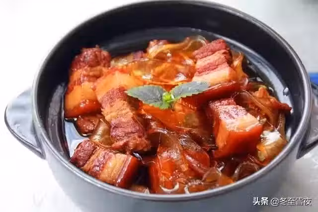 【豬肉燉粉條】所需材料:豬五花肉 1000克 、寬粉條(干) 1把、油鹽適量、紅燒醬油 2湯匙、 特級醬油 1湯匙、 料酒 2湯匙 、蔥 1段 、姜 2片 、蒜 2瓣、花椒 10粒 、八角 2個 、干辣椒2個、 冰糖2湯匙 、