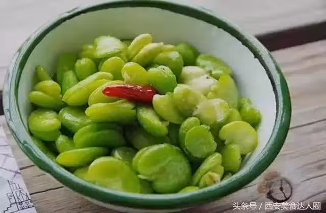 用料:新鮮蠶豆(胡豆)300克、大蒜2粒、鮮紅小米辣4個、香蔥2根、香菜1根、鹽適量、芝麻香油1湯匙、白糖1/2茶匙