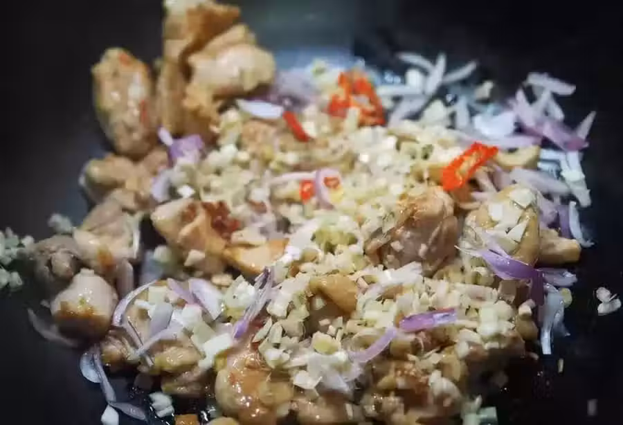 1、香茅和醬油醃雞肉1小時(放冷藏),準備其他食材,準備醬料,醃好後,雞腿肉下鍋煎香上色,放入紅蔥頭、辣椒、蒜末及香茅拌炒。