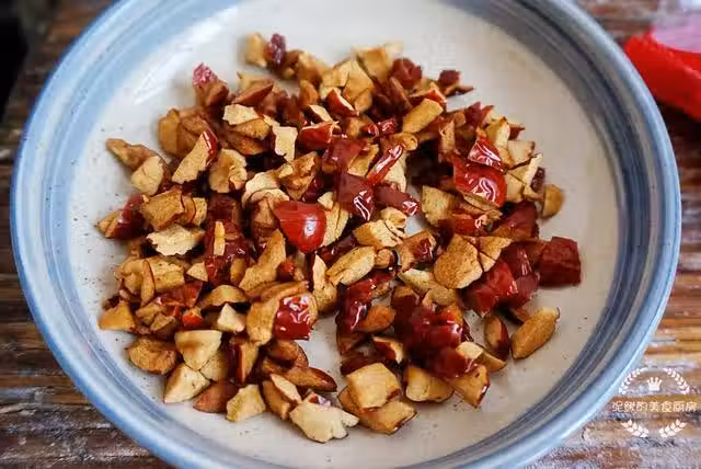 1.紅棗提前洗凈,放入清水中浸泡,之後去核切成小丁。