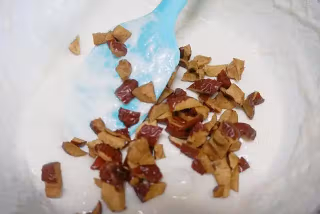 4.將切好的紅棗粒倒入發酵好的麵糊中拌勻。