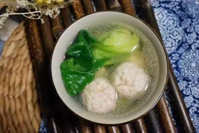 5.湯中加入1克鹽,少許白鬍椒粉,肉丸漂起,放入洗好的油菜,關火。