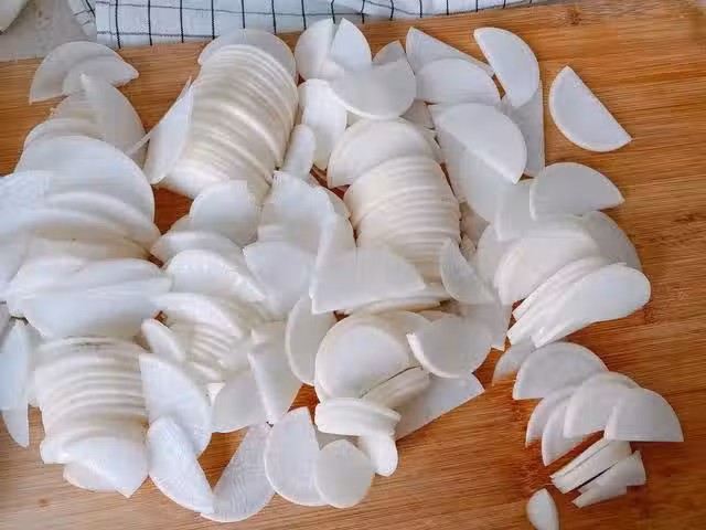 2、蘿蔔切成片之後需要先腌制一會,往蘿蔔片裡面加入2勺食鹽,攪拌均勻,放在一邊腌制半小時,殺出多餘的水分,這樣能讓蘿蔔吃起來口感更加脆爽,不建議省略這一步;