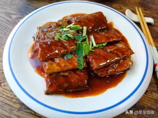 6.待剩少許湯汁時,關火,將帶魚盛出,撿去蔥姜蒜,花椒,干辣椒不要,將剩下的湯汁,淋在帶魚上,撒上香菜段即可。