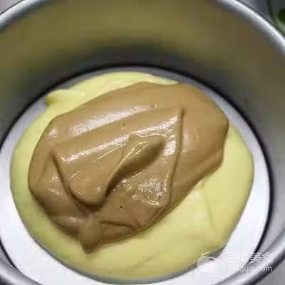 16、原味糊和可可糊交替用勺子舀一勺,放在模具里,可以輕輕搖晃模具,也可不搖。(一般情況是用小勺,我這次用的大湯勺,