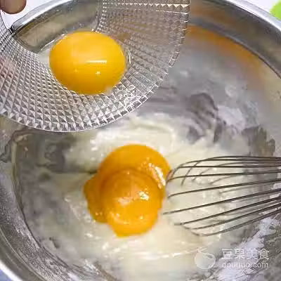 3、倒入蛋黃,繼續Z字攪拌(蛋黃蛋白分離後,蛋白用無水無油的盆裝好放冰箱冷藏備用)