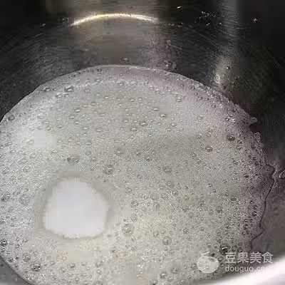 5、這一步開始前去預熱烤箱150度。取出蛋白盆,加幾滴檸檬汁,高速打發至粗泡,加入三隻之一糖,繼續打發