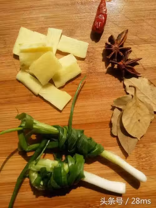 7. 蔥打結、兩個八角、4-5片香葉,姜