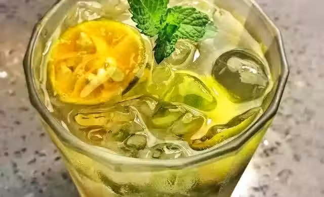4 青桔切片放入杯子,鮮薄荷葉揉搓一下,也放入杯子,衝入調好的茶汁即可