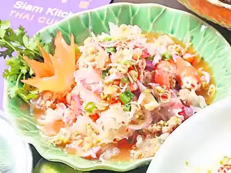 蝦4隻、新鮮雪耳150g、梅花豬絞肉80g、蔥10g、香菜3g、香茅40g、紅蔥頭30g、小番茄2顆、涼拌醬80g