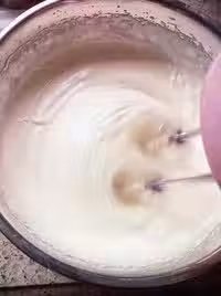 2.打蛋器轉低速、在蛋盆的側面打發、盆轉手不動、一個位置停留約10秒、然後輕輕逆時針小幅度轉動蛋盆直至氣泡消失蛋糊細膩均勻富有光澤