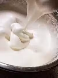 3. 一次性倒入篩好的澱粉和低粉(事先混合)、快速大幅度攪拌30~40次(從2點至8點方向刮拌並迅速轉動蛋盆)