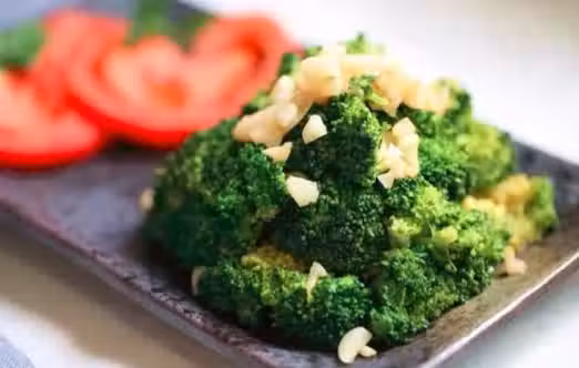 3.鍋中倒油,將蒜子下鍋爆香,將西蘭花倒入鍋中翻炒,加入半勺鹽、半勺糖,翻炒至西蘭花完全變熟。