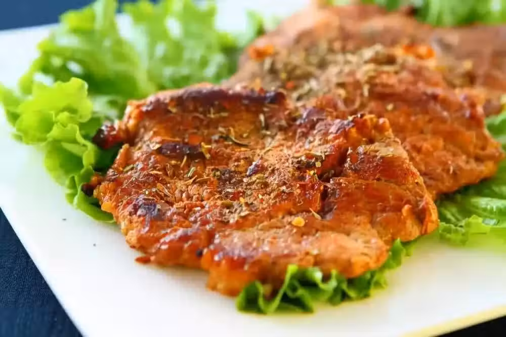 3、熱鍋下油,放上腌制好的豬排,以中火煎至上色,翻面再煎至上色,煎熟後即可。