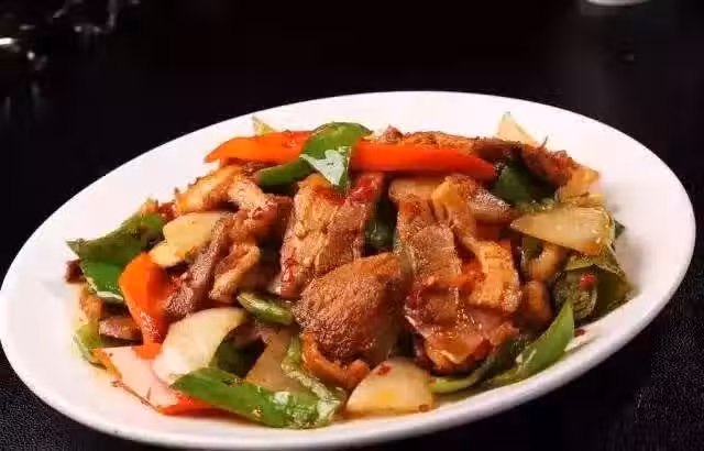 5、再放入青椒片、胡蘿蔔片翻炒,最後放入鹽、糖炒勻裝盤。
