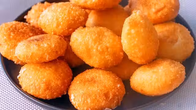 6、炸到兩面金黃焦脆,就可以撈出來控油了,我們的糖糕就做好了,非常的焦脆,我們掰開看一下,裡面個個都是空心的,白糖也完全融化了,非常的香甜,我這個糖糕做的比較小,剛好一口一個。