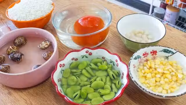 2、干香菇8個加溫水泡發,乾貝10粒也加水泡發,接著我們加1把玉米粒、1把豆子,再準備臘腸1根切片;