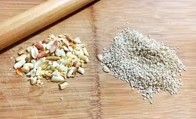 2、將花米炒香,然後與熟芝麻一起用擀麵杖碾碎。