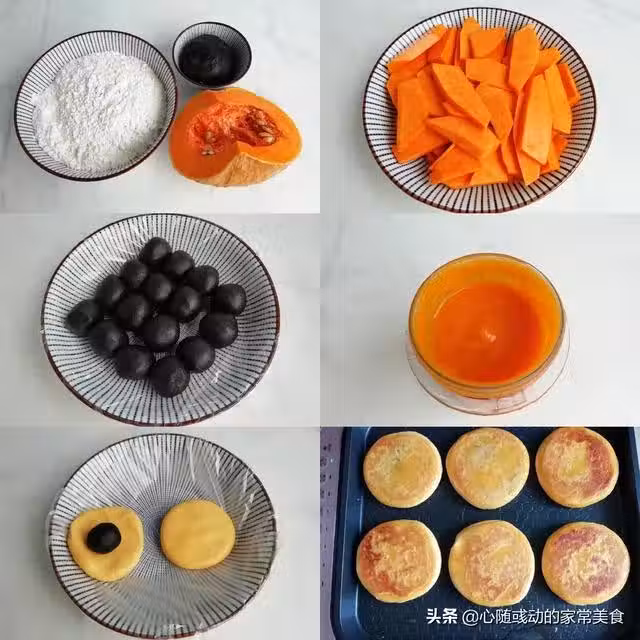 5.把南瓜泥加入粉中,揉成光滑的麵糰,取一份小麵糰,按扁包入黑芝麻餡,用虎口收攏,封口後再輕輕按扁,做成一個餅狀。