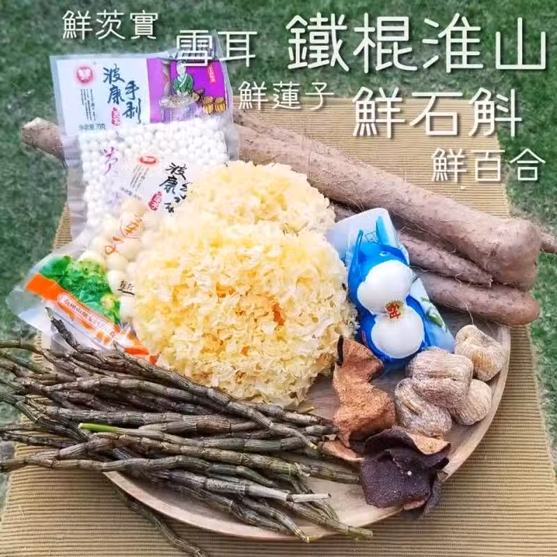 鐵棍淮山、鮮石斛、鮮百合、鮮蓮子、鮮茨實、雪耳配蜜棗、果皮、冰糖