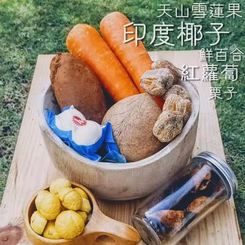 印度椰子、天山雪蓮果、鮮百合、紅蘿蔔、栗子配蜜棗、果皮
