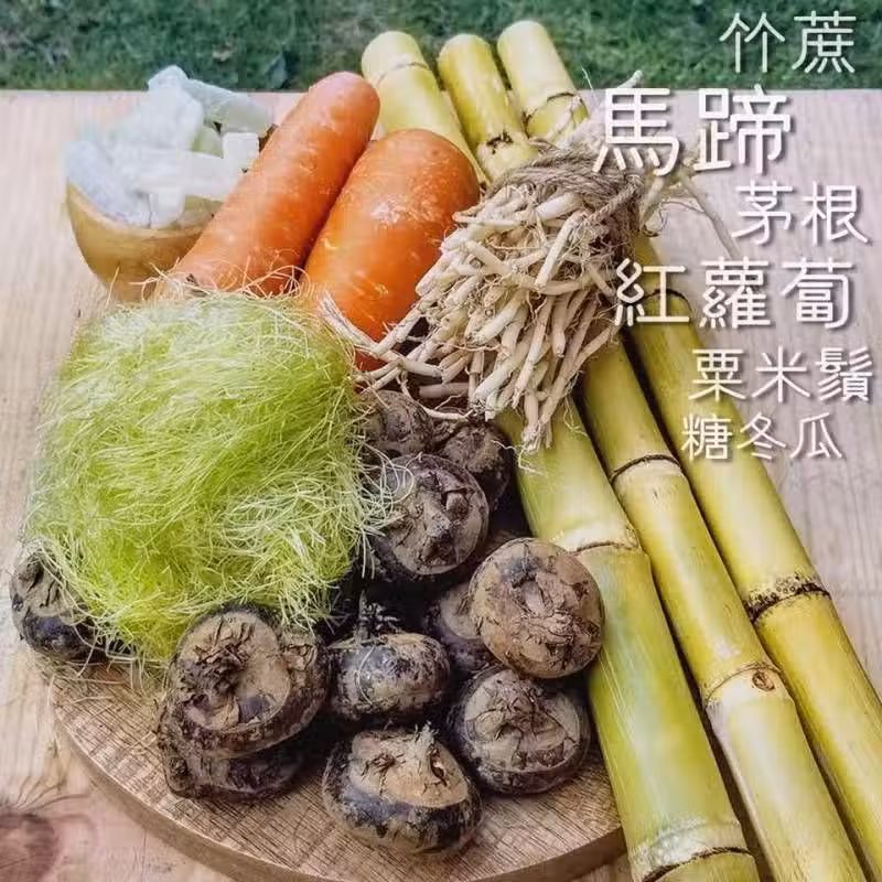 竹蔗、馬蹄、茅根、粟米鬚、紅蘿蔔、糖冬瓜