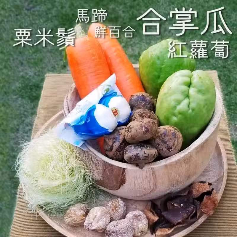 合掌瓜、馬蹄、鮮百合、紅蘿白、粟米鬚配蜜棗、果皮、冰糖