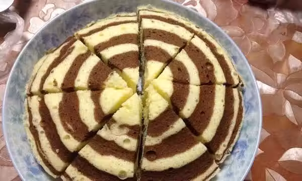5.將一大匙白色麵糊倒入烤盤中心,然後再倒入一大匙巧克力麵糊在白色麵糊中心,再用白色麵糊倒在巧克力麵糊中心,以此類推,至所有麵糊倒完為止。