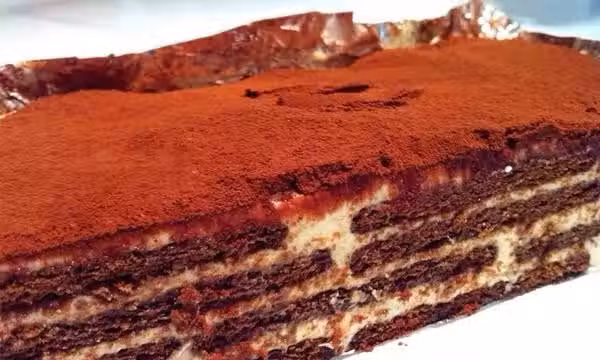 3.把餅乾在盤上排滿一列,在其上倒一層起士糊;以此類推一層餅乾,一層起士糊,重複做完為止。
