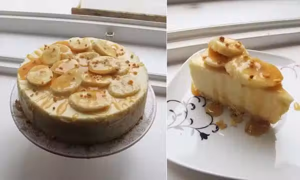 1.蛋糕取出脫模後,可以灑上切片的香蕉與淋上自製或現成的焦糖醬,再隨性的灑上適量的堅果粒,就完成了。