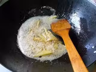 鍋里放黑芝麻油,放入老薑炒一會,薑絲邊緣微黃即可。